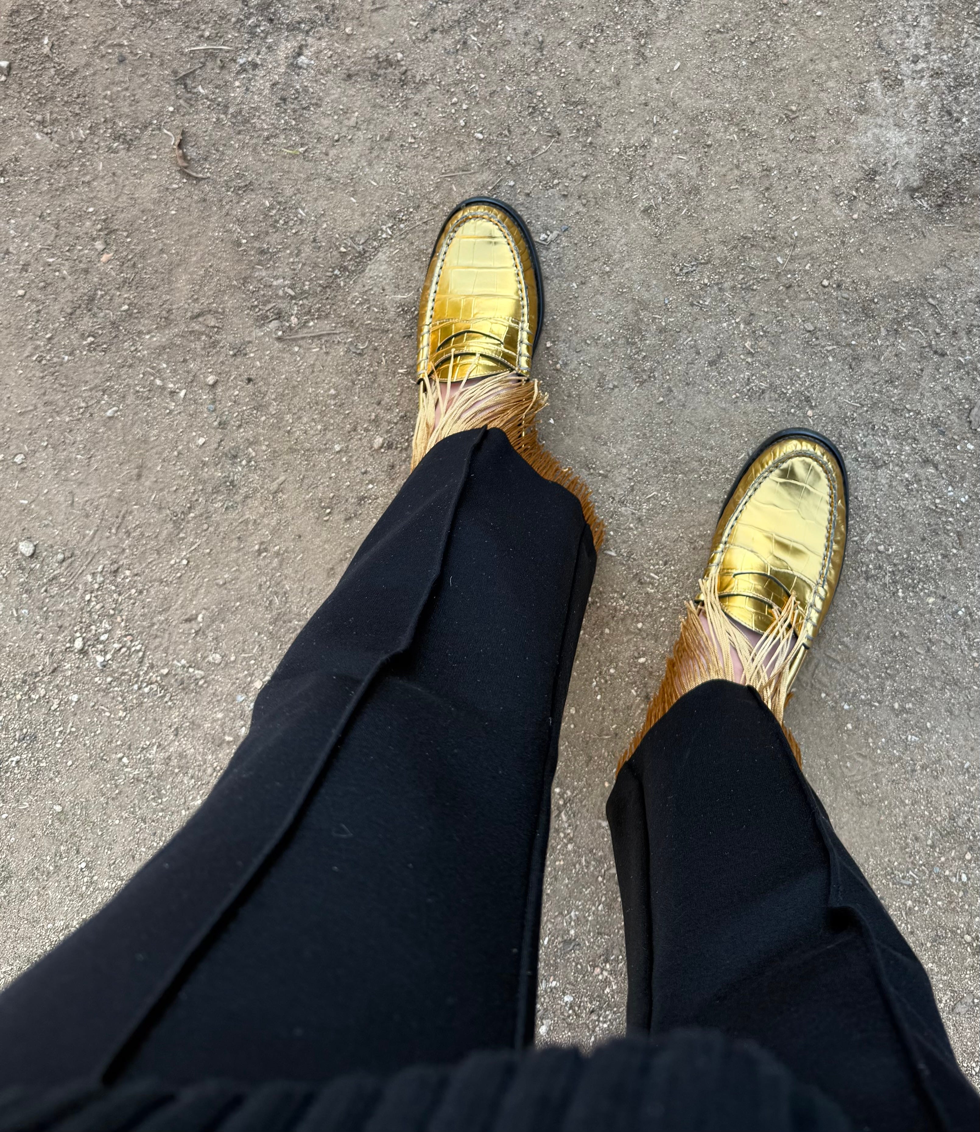 I don’t know about you, but when everyone and their sister was raving about the High Sport pant, I definitely got interested. (In fact, one of my very first Substacks was about finding less expensive versions of these!) Needless to say, I ended up with several pair of black kick flare pants in my closet that rarely see the light of day, so I took the pair I like the least and with fringe I found on Etsy for next to nothing, we attached it to the inside hem.